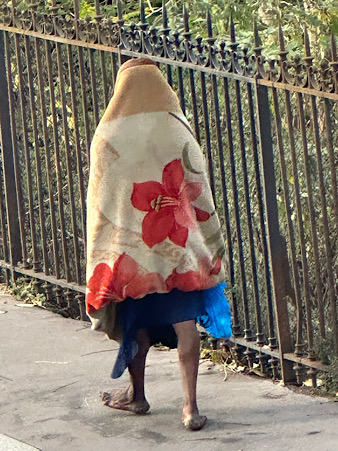 Tu croises un type entre 35 et 45 ans qui marche pieds nus sur un trottoir parisien, vêtu d’un drap et d’une sorte de tapis sur le dos, à la fin du mois d’octobre 2025.